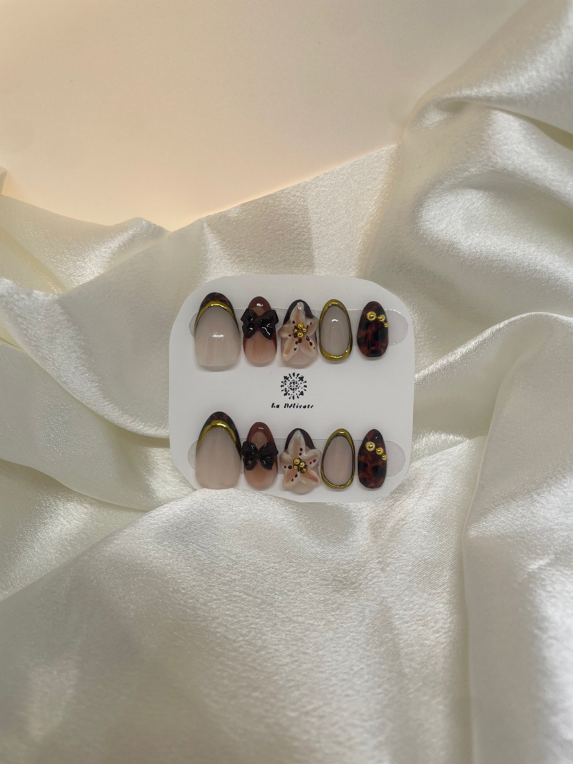 A sophisticated blend of nude and deep chocolate tones, highlighted with golden details and delicate embellishments. Perfect for a chic and timeless look.